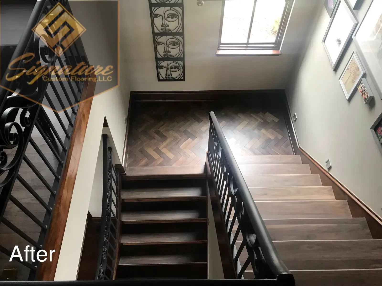 In addition to this, the landing area between the flights of stairs was in a herringbone pattern which makes additional work for the sanding process, especially because this floor was going to be stained a different color. Knowing that this floor was about to undergo some major changes, it was crucial to make sure that we set ourselves up for success.